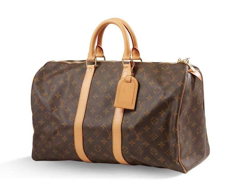 Sac de voyage "Keepall" 45 en toile monogrammée et cuir naturel. Double poignée en cuir. Avecson cadenas et ses clés.