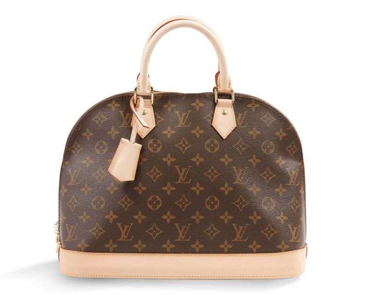 Sac Alma en toile monogrammée et cuir naturel surpiqué jaune. Garniture en métal doré. Fermeture zippée, double anse. Double poche plaquée. Tirette, manque clef.