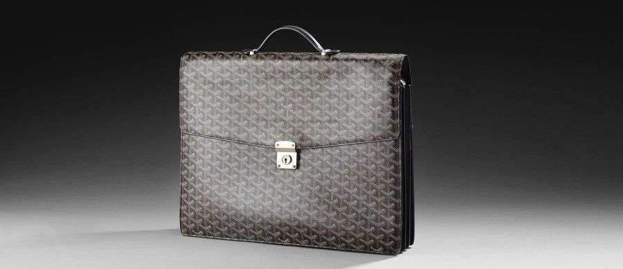 Serviette "Chypre" en toile enduite noir et cuir naturel, piqûres sellier noires. Garniture en métal argenté. Poche à l'arrière. Ouverture par rabbat avec double poche plaquée. Intérieur en cuir moutarde à trois soufflets. Le soufflet central se fermant avec fermeture éclair. Poignée en cuir naturel.Très bon état.