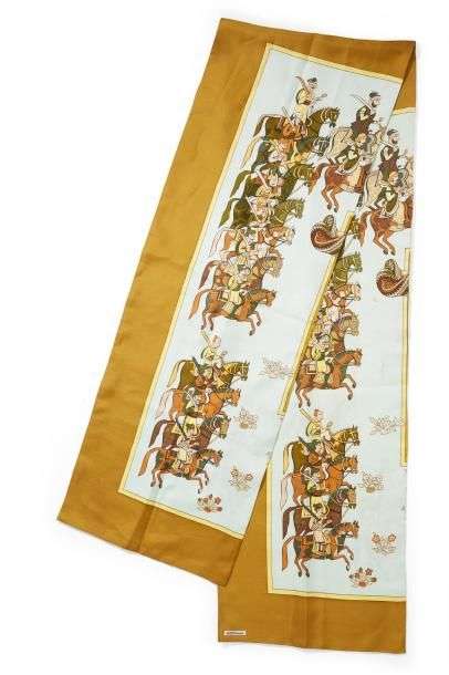 Grande étole en soie imprimée à motifs polychromes de cavaliers, signé P. Péron.
