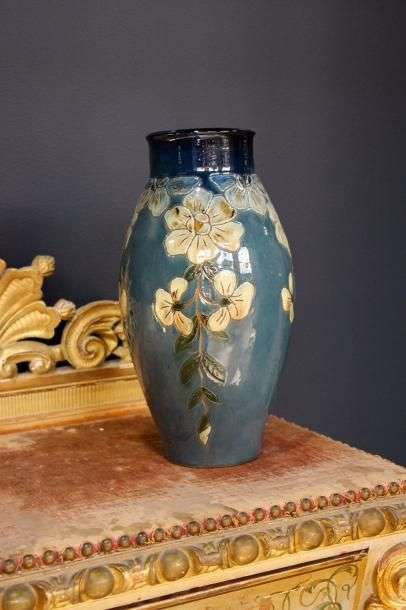 en faience à motifs de fleur sur fond bleu, signé Fourquet