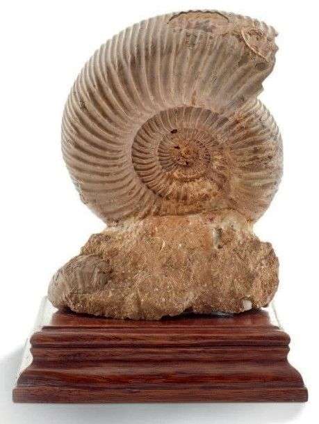 Ammonite Perisphinctes nacrée, présentée sur un socle, Oxfordien, Jurassique, Zakara, Madagascar