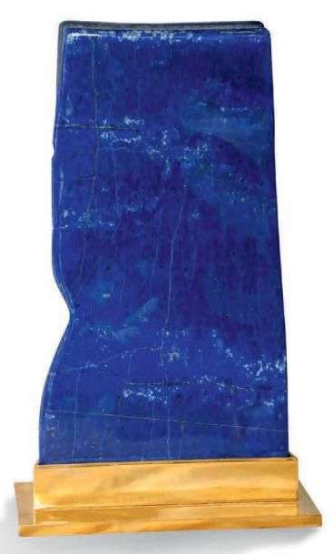 Lapis Lazuli présentée sur son socle de bronze arborant le bleu klein recherché. Utilisée comme précieux pigment bleu outremer au Moyen-Âge.