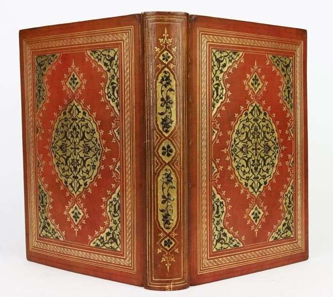 In-8, maroquin brun, plats et dos ornés de motifs arabes noir et or, liserets dorés intérieurs, gardes de soie brodées, couv. et dos, tête dorée, étui (Reliure de l'époque).
