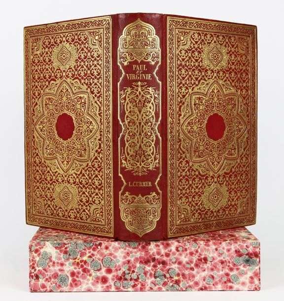 Grand in-8, chagrin rouge, dos lisse et plats très richement ornés d'une plaque orientale dite “à l'indienne”, tranches dorées, étui (Reliure de l'éditeur).