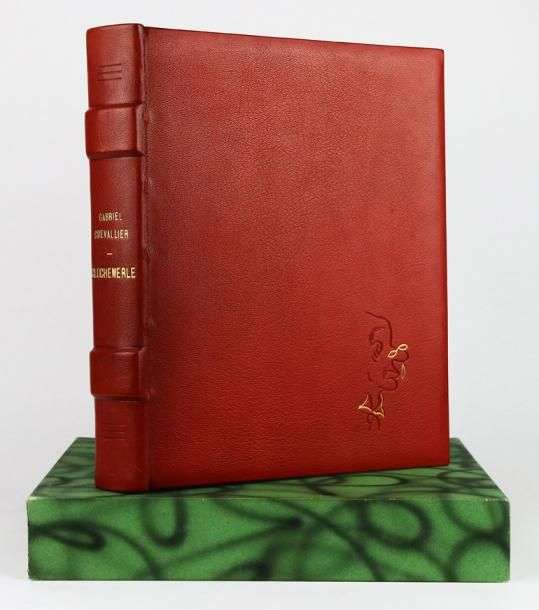 In-4°, maroquin orange, petite composition humoristique à froid et doré en bas du premier plat, encadrement intérieur de maroquin de même teinte, gardes de papier velours vert, couv. et dos, tête dorée, étui bordé (O. Saulin).