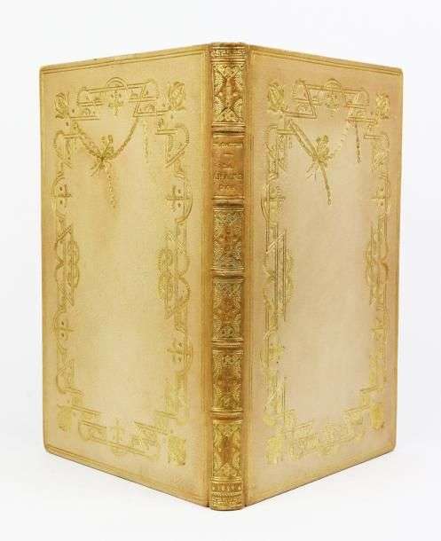 In-4°, maroquin beige, plats richement ornés de motifs dorés géométriques et floraux, dos à nerfs orné, large dentelle à chainettes dorées intérieure, doubles gardes de papier à motifs dorés, couv. et dos, tranches dorées sur témoins, étui (Petitot).