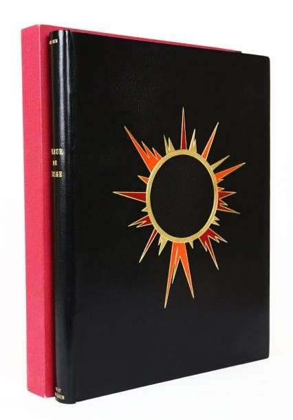 In-4°, maroquin noir, plat orné d'un grand soleil stylisé rouge, jaune, or et orange, couv. et dos, tête dorée, étui bordé (Saporito).
