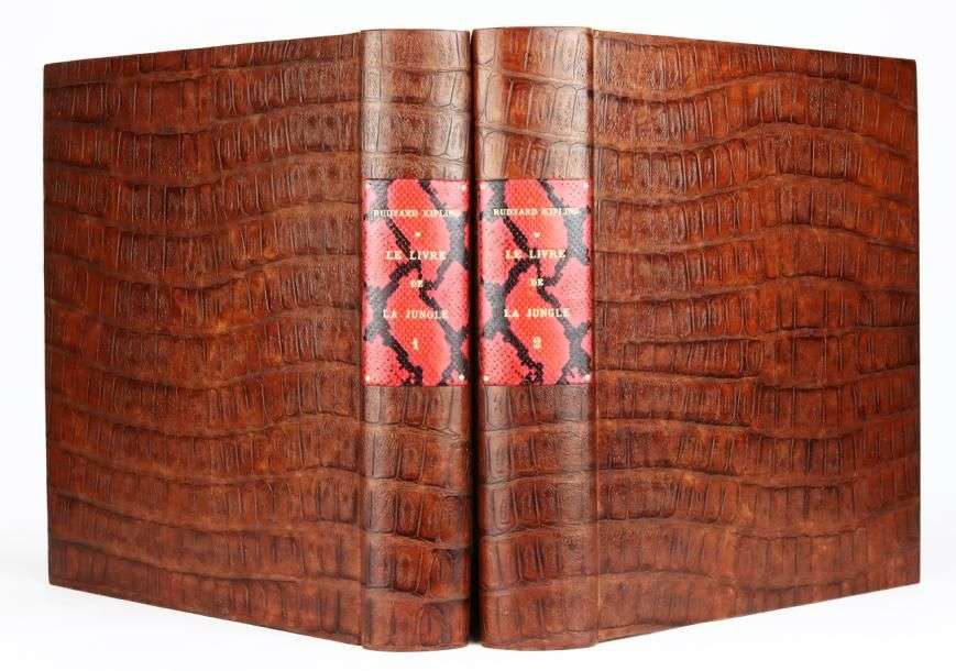 2 volumes in-4°, plats recouverts de cuir imitant le crocodile, dos ornés d'une pièce de titre de serpent, gardes imitation serpent, couv. et dos, tête dorée (Saporito).