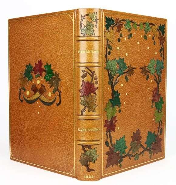 In-4°, maroquin lavallière, plats richement ornés d'un décor mosaïqué de feuilles de maroquin vert de différents tons avec un semis de pastilles dorées, large encadrement intérieur mosaïqué avec filets et pointillés dorés, gardes de soie mauve, double garde, couv. et dos, tranches dorées sur témoins, étui bordé (David, 1923).