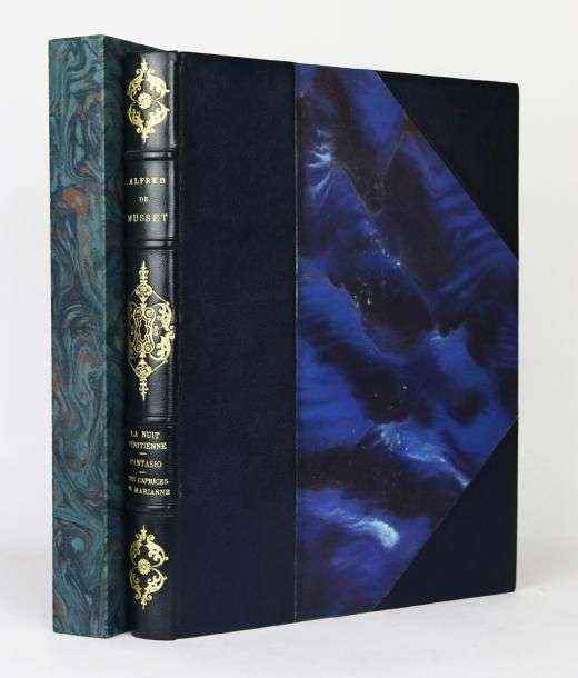 In-4°, demi chagrin bleu marine à coins, dos à nerfs très orné, couv. et dos, tête dorée, étui bordé (Reliure postérieure).
