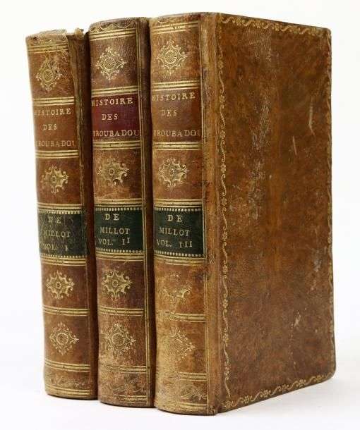 Histoire littéraire des troubadours... Paris, Chez Durand neveu, 1774, 3 vol. in-12, basane racinée, dos lisse orné (Reliure postérieure).