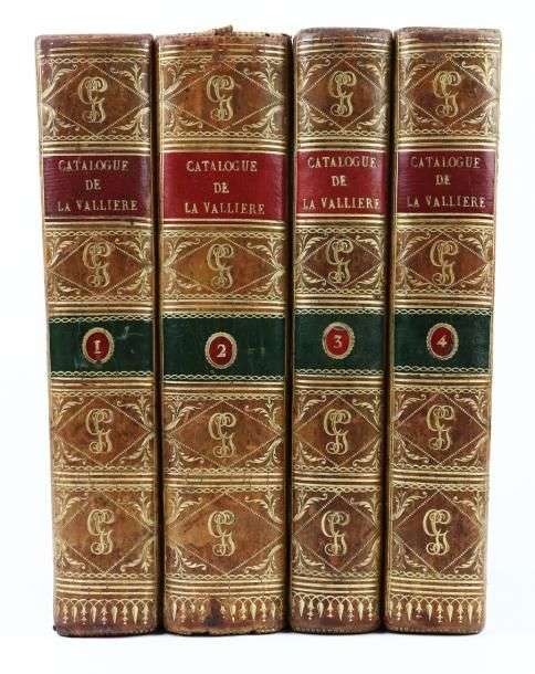 Catalogue des livres de la bibliothèque de feu M. le duc de La Vallière... par Guillaume de Bure. Paris, de Bure fils aîné, 1783. 4 volumes in-8, basane fauve, dentelle dorée sur les plats, dos lisse ornés du monogramme GG en lettres dorées, tranches rouges (Reliure de l'époque).