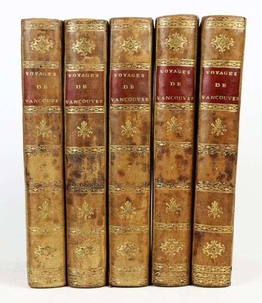 Voyage de découvertes, à l'Océan Pacifique du Nord, et autour du monde, entrepris par ordre de sa Majesté Britannique, exécutés, pendant les années 1790, 1791, 1792, 1793, 1794 et 1795, par le capitaine George Vancouver. Paris, de l'Imprimerie de Didot le Jeune, an X (1802). 5 volumes in-8, basane racinée, dos lisse orné (Reliure de l'époque).