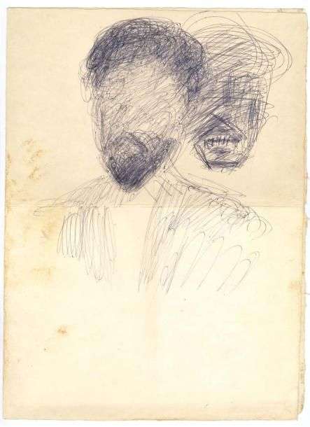 Deux dessins originaux au stylo à billes de Salvador Dali au recto d'un feuillet de papier fort représentant des esquisses de visages, et sur le quart du feuillet, des essais de signatures toujours au stylo à billes par Salvador Dali.