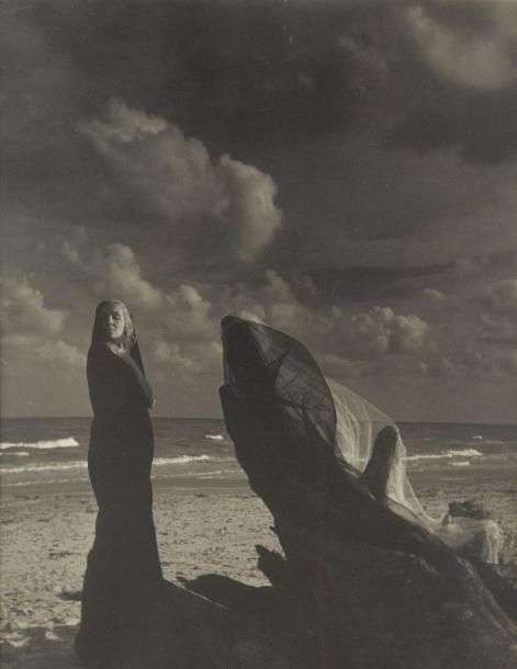 Tirage argentique d'époque représentant une femme dont on ne distingue que le visage près d'un étrange massif de bois flotté.