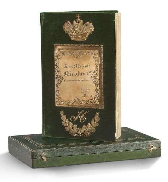 Green velvet binding, cover decorated with emblems of the Tsar of Russia and a painting by Eugène ISABEY.