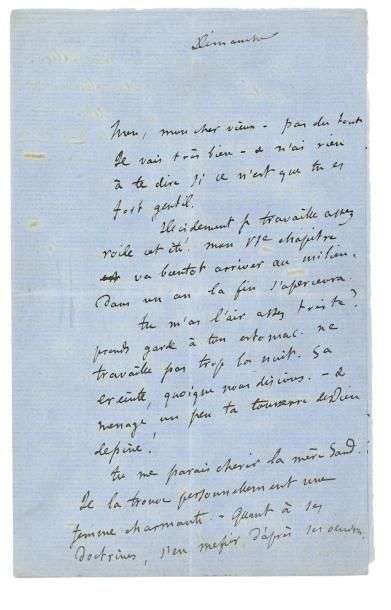 L.A.S., [Croisset] Dimanche [21 août 1859], à Ernest FEYDEAU| 6 pages in-8 sur papier bleu.