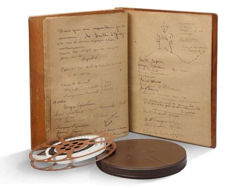 16分钟胶卷展示作者与友人Consuelo的游船情景,1942年于加拿大蒙特利尔;胶卷直径:98毫米,现代棕色盒子直径:180毫米,持续时间:1分钟,2分19秒中50秒;附游船留言本,作者于友人签名,含《小王子》形象图(32x25.5厘米).