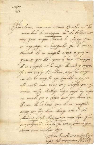«Madame, nous nous sommes assamblés mr le marechal de Matygnon mr de Belyevre & moy pour avyser durant le voyage que je vay fayre an Languedoc par le comandemant de sa magesté a tout se quy se presante par desa pour le byen & servyce de sa magesté & le repos de ceste provynce. Je vous suplye Madame, tenyr la mayn ace que sa magesté ayt agreable ce quy a esté aresté antre nous & y vueylle pourvoyr comme aussy voulloyr croyre quyl nya ryen au monde que je desyre tant que lheur & lhoneur de la bonne grace de vos magestes aynsy que Jay donné charge aux srs de Clervant et de Chassyncourt vous dyre plus partyculyerement lesquels yls vous plera croyre comme vous voudryes fayre. Vre tres humble & tresobeyssant suget fyls et servyteur Henry».