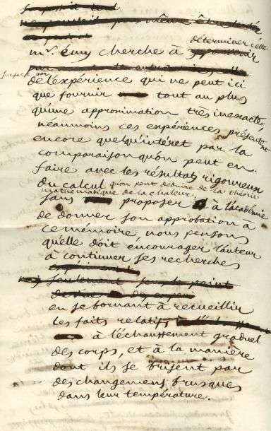 Ampère, qui a raturé plusieurs lignes de sa critique, se montre sévère. La première partie du mémoire «rapporte un grand nombre d'expériences sur la distribution de la chaleur dans les corps solides| dans l'autre il se livre à des conjectures purement hypothétiques sur le magnétisme et l'électricité [...], et l'hypothèse fondamentale ne paraît appuyée ni sur les faits connus ni même sur les propriétés d'après lesquelles l'auteur essaye de donner quelque vraisemblance à cette hypothèse»... Les expériences de M. Emy «sur l'éclatement des corps de différentes figures lorsqu'on en change subitement la température ne peuvent qu'intéresser les physiciens»| elles font suite aux précieuses observations de M. FLEURIAU DE BELLEVUE sur les aérolithes, publiées en 1820. Ampère cite d'autres expériences d'Emy, qui présentent de l'intérêt «par l