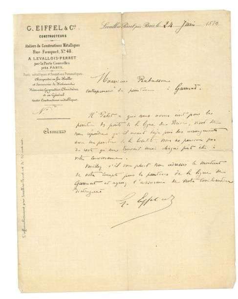 * L.A.S., Levallois-Perret 24 juin 1870, à M. RABUSSON, entrepreneur de peinture à Gannat| 1 page in-4 à son en-tête G. Eiffel & Cie constructeurs.
