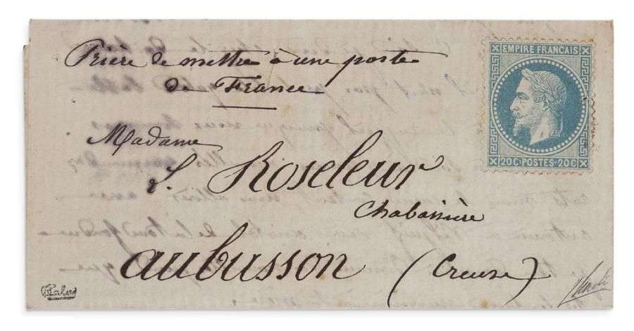 Lettres adressées pendant le Siège de Paris de 1870-71 par Alfred ROSELEUR à sa femme Léonie, restée dans leur château près d'Aubusson, à l'aide de ballonnets lancés de son balcon rue des Gravilliers, après avoir indiqué préalablement sur les enveloppes: «Prière de mettre à la poste de France».