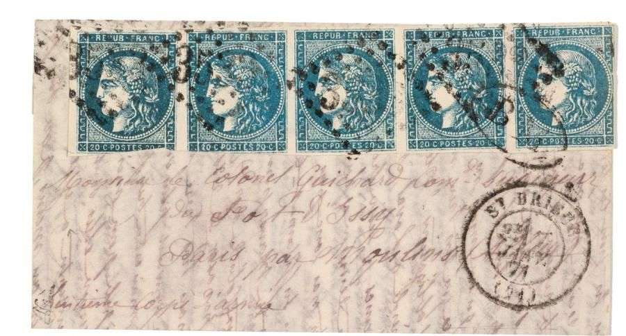 - Lm datée de Pontrieux (Côtes-du-Nord) 6 janvier au soir, affr. bande de 5 n°45, 20c. bleu Bordeaux t. II, obl. los. 3533 (peu lisible) et B.M. dans un ovale, frappée c.à.d. St. Brieuc (21) 2e/7 janv. 71 - Sans cachet d'arrivée.