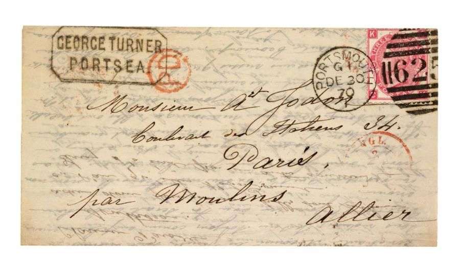 AFFRANCHISSEMENT ANGLAIS Lm datée de Southsea avec indication "Paris par Moulins" affr. n°21 de Grande-Bretagne 3p. rose obl. 625 (ovale vertical), frappé c.à.d. Portsmouth DE-30-70 + cachet P.D.