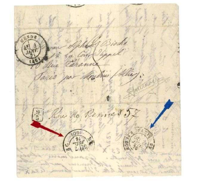 Lm datée de Mende (Lozère) 4 janv. 71, avec indication "Paris par Moulins", sans affranchissement, c.à.d. Mende (46) 4e/janv. 71. Au verso: c.à.d. Paris (60) RC/5e/7 juil. 76 et c.à.d. Paris-R. St Dominique 5e/ 7 juillet 76. Cachet de facteur parisien. Rare lettre de repêchage de 1876