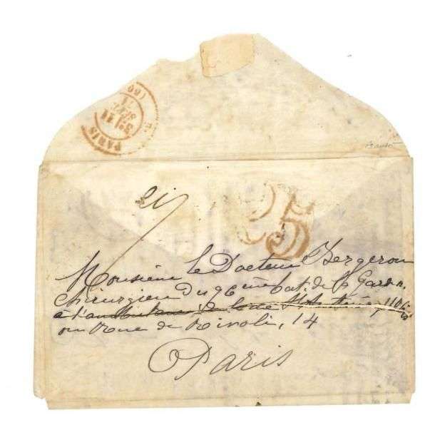 LETTRE CONFIÉE À LA SEINE INSÉRÉE DANS UN RÉCIPIENT MÉTALLIQUE Lm. datée du 2 novembre 70, adressée sous enveloppe à Paris, non affranchie, taxée 25c. double trait en rouge (changement de tarif). Lettre adressée au Dr Bergeron chirurgien du 96e bataillon de la Garde à Paris, confiée à la Seine et retrouvée à Corbeil. - Au verso: c.à.d. de Paris (60) 3e/11 sept. 71 en rouge et cachet de facteur parisien.
