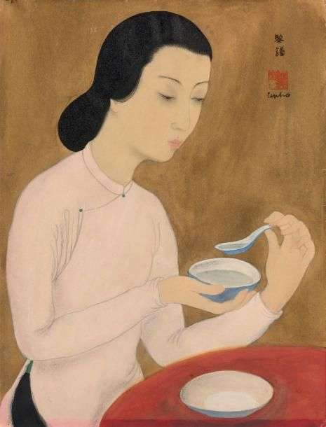 Le Pho's ability to maintain his Vietnamese identity while employing Western techniques. Like the bowl she brings to her lips and the table where she is sitting, the young woman's beauty is represented in roundness. From her shoulder's light curve to the bun of her hair through to her wrist depicted as rounded, this work on paper is a subtle rendering of curved femininity, suggested by the graceful gesture.
