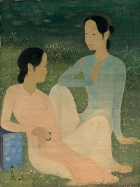 Two women, elegantly sitting on grass dotted with daisies, seem to be in conversation. The scene's infinite gentleness comes from their clear complexion and gentle curves, which draw the viewer's eye to their delicate faces.