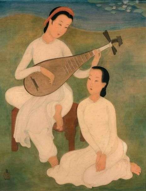 Deux femmes partagent ici un instant musical au bord de l'eau: l'une joue d'un instrument, tandis que l'autre semble écouter avec attention, les mains jointes et le regard tourné vers la musicienne. Fidèle à son style délicat, l'artiste souligne avec finesse l'ovale des visages et les silhouettes graciles des jeunes filles. Leurs courbes féminines font écho aux méandres de la rivière, dont on pourrait presque entendre le doux bruit se mélanger aux douces notes de la mandoline. Les couleurs claires de leurs vêtements et leur teint pâle mettent en valeur la beauté de leurs traits, rehaussés par le rouge de leurs lèvres et l'ébène de leurs chevelures.
