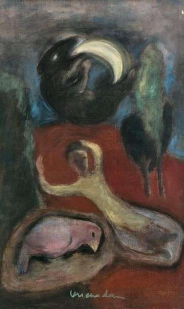 La palette sombre de la nuit enveloppe la scène de son voile mystérieux. La jeune femme, vêtue d'un jaune solaire, repose sur un parterre rouge, couleur de l'érotisme. Le clair de lune chasse les ténèbres et diffuse sa lumière protectrice en imprégnant cette encre d'une étrange quiétude. Le spectateur peut donner libre cours à son imagination: la jeune femme alanguie ferait-elle un songe?