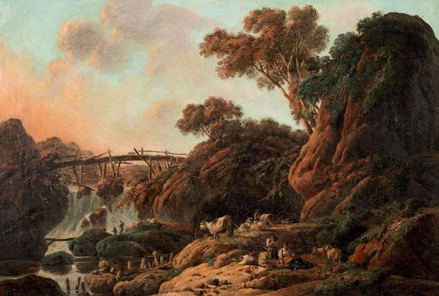 Bergers dans un paysage de cascade 46,5 x 67,5 cm