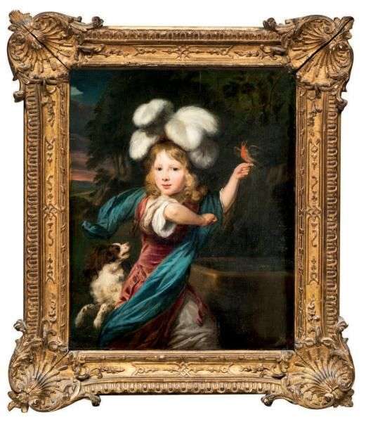 Notre charmant portrait d'enfant accompagné d'un chien se rapproche ainsi par sa pose et ses attributs de deux portraits du peintre publiés par Sumowski (voir W. Sumowski, Gemälde der Rembrandt-Schüler, Landau, 1983, vol. III, n°1418 et n°1419, reproduits) qui présentent également des jeunes garçons coiffés de plumes et jouant avec un oiseau. Mais les traits de l'enfant avec son ovale régulier et ses boucles blondes rappellent encore davantage le portrait de Maes conservé à la Gemäldegalerie der Akademie der bildenden Künste, de Vienne (voir W.