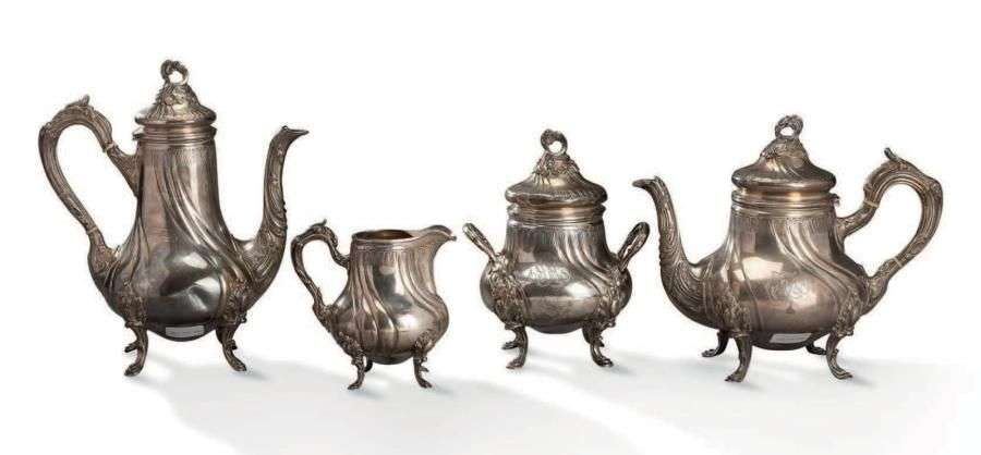 SERVICE À THÉ ET À CAFÉ EN ARGENT chiffré AA, panses à côtes torses et déc