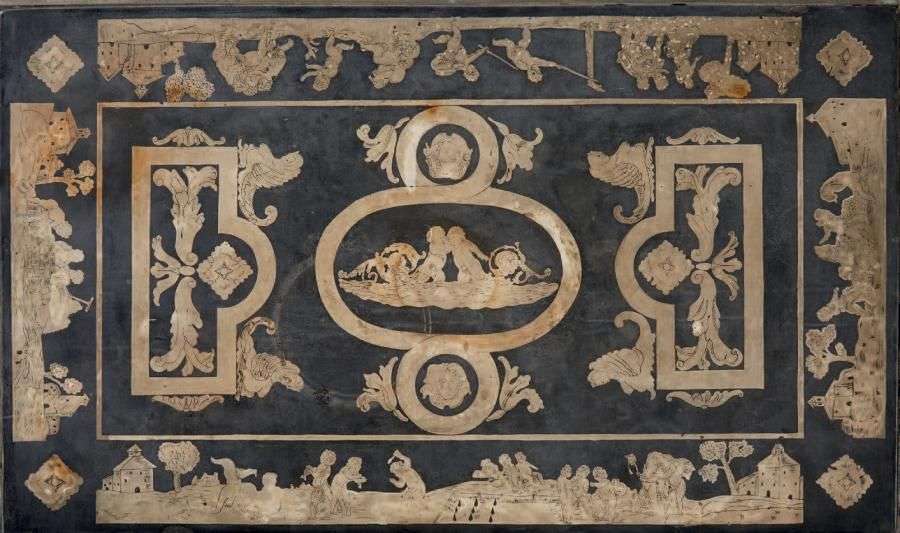 PLAQUE EN SCAGLIOLE à décor en grisalle représentant au centre un médaillon aux putti flanqué de deux encadrements ornés de fleurons, rinceaux et sphinges.