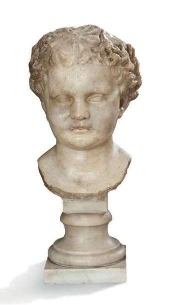 TÊTE DE PUTTO LAURÉ EN MARBRE BLANC Base à piedouche en marbre.