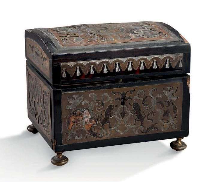 PETIT COFFRET de forme rectangulaire en marqueterie Boulle d'écaille, étain et laiton.