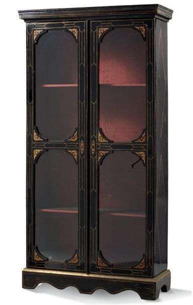 BIBLIOTHÈQUE de forme rectangulaire en placage d'ébène et filets de laiton. Elle ouvre par deux portes en partie vitrées ornées d'écoinçons en bronze (rapportés)