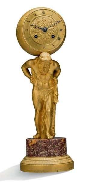 BELLE PENDULE en bronze ciselé et doré figurant Atlas. Le cadran inscrit d