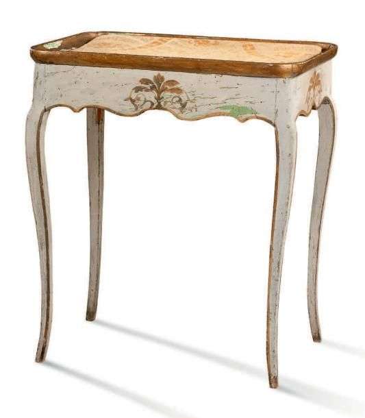PETITE TABLE à plateau cabaret en bois mouluré sculpté et laqué gris à déc