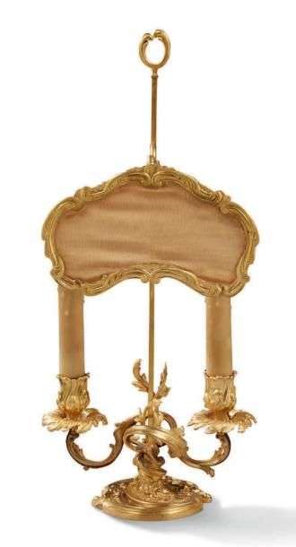 PETITE LAMPE BOUILLOTE à deux lumières à écran ovale chantourné en bronze ciselé et doré à riche décor rocaille d'acanthes, enroulements et volutes feuillagées.