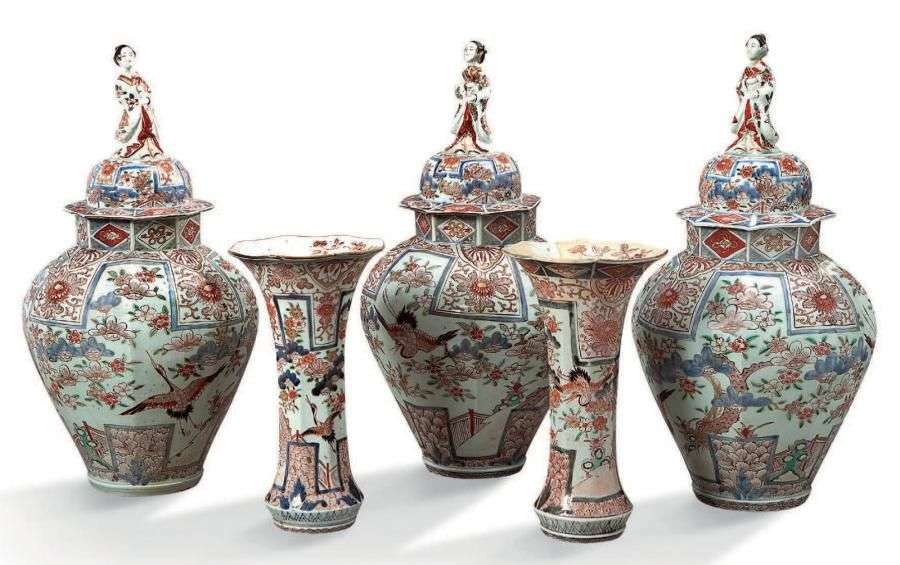 IMPORTANTE GARNITURE en porcelaine polychrome Imari à décor d'oiseaux exotiques dans un fond de paysage fleuris et motifs stylisés comprenant trois potiches facettées couvertes surmontées de personnages en habits traditionnels et deux vases cornets.