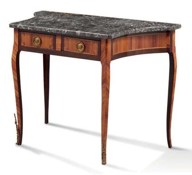 CONSOLE toutes faces de forme trapézoidale en bois de rose et bois de placage dans des encadrements. Elle ouvre en façade par deux tiroirs et repose sur quatre pieds cambrés.