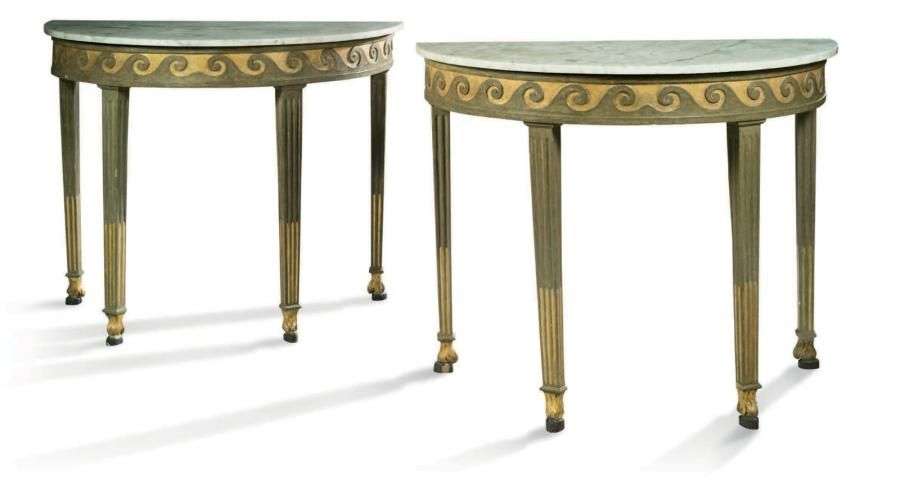 PAIRE DE CONSOLES de forme demi-lune en bois laqué vert bronze et or, la ceinture est ornée d'une frise de postes.