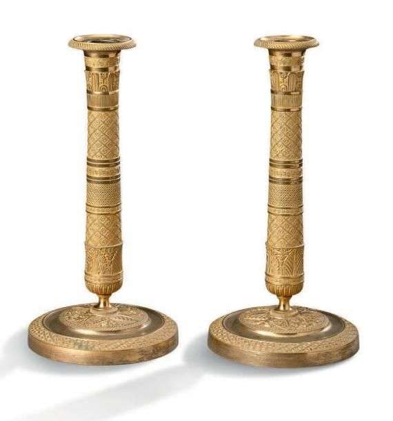 PAIRE DE BOUGEOIRS en bronze ciselé et doré, binet orné d'un rang de perles et fût à décor alterné de fleurettes sur fond quadrillé, palmettes et pampres. Base circulaire ornée de palmettes et fleurettes.
