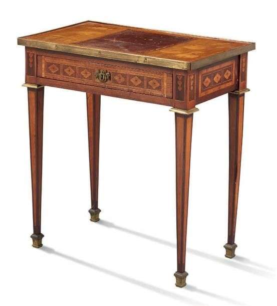 PETITE TABLE À ÉCRIRE de forme rectangulaire en placage de bois de rose, bois de violette, bois fruitier et amarante. Elle ouvre par un tiroir à décor d'une frise de quartefeuilles en ceinture, garni de deux encriers. Le plateau est gainé d'un cuir rouge en son centre et marqueté d'un décor à l'échantillon. Elle repose sur quatre pieds fuselés terminés par des sabots de bronze.